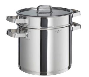 Einzelheiten: Ein echtes Allround-Talent. Suppen, Eintöpfe, große Mengen Kartoffeln und Gemüse sind in dem Kochtopf mit Pastaeinsatz SAN REMO von KÜCHENPROFI bestens aufgehoben. Denn mit seinem Fassungsvermögen von sieben Litern steckt er einiges weg. Perfekt, wenn Sie für viele Personen oder auf Vorrat kochen möchten. Für noch mehr Abwechslung in Ihrer Küche sorgt der Pastaeinsatz. Pro 100 Gramm Teigwaren messen Sie einen Liter Wasser mit der praktischen Topf-Innenskala ab. Dann garen Sie die Nudeln in dem Sieb und nehmen sie sicher aus dem heißen Wasser. Gut durchdacht ist auch der Rest des Topfes. Der extra starke Mehrschichtboden ist für alle Herdarten inklusive Induktion geeignet und verteilt die Hitze gleichmäßig. Der Deckel aus Sicherheitsglas gewährt Ihnen den vollen Durchblick und an den wärmeisolierten Griffen bringen Sie den Erbseneintopf direkt auf den Tisch.